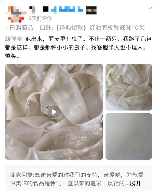 而在多个电商平台上的阿宽食品官方旗舰店内,消费者的质疑声也不绝于耳。一位消费者在购买评论中表示,“面皮里有小虫子,不止一两只,泡了好几包都是这样,找客服半天也不理人。”