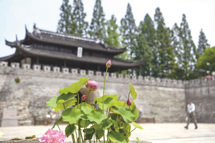 站在城门前,仰观子城,巍峨的城门、斑驳的城墙、居中的谯楼,四角飞檐、凌空翘首,两侧各有垛楼拱卫,气势如虹,仿佛正在述说800多年前,嘉兴升府后的新气象。