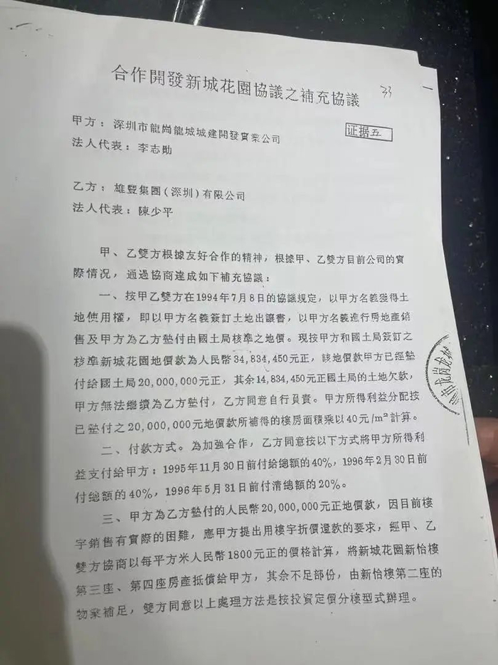 所以,1993年,香港雄丰在当地的介绍推荐下,与深圳市振业股份有限公司(下称深振业)、深圳市龙岗镇物业发展公司(后改名为九州公司)签订了《合作开发新城花园商住楼合同书》,其内容是由雄丰公司、九州公司出地,为甲方;由深振业出资,为乙方,三方共同合作兴建新城花园商住楼,即龙岗镇新生村新城花园项目。
