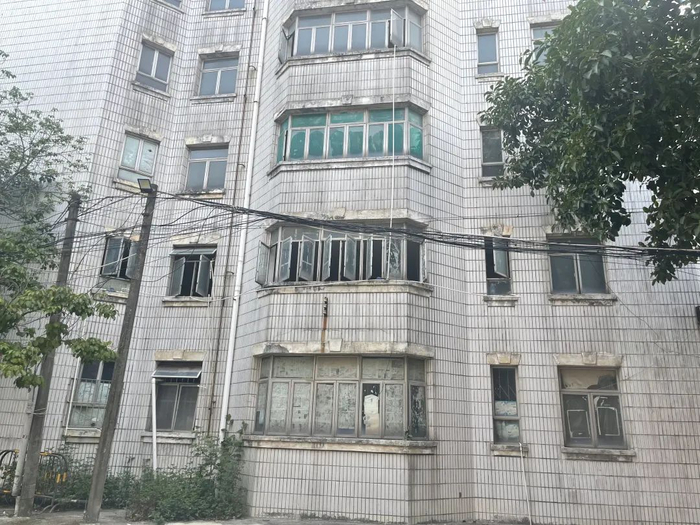 《每日经济新闻》记者沿着苑安路,穿过锦城星苑,几栋港风建筑突兀地立在眼前,几扇已经没了玻璃的大窗户,远远看过去,像是黑色的洞窟。现在清退工作完成后,包括烂尾楼后排已经入伙居住的楼栋被分成三个围合。透过围合的挡板缝隙,可以看到二楼平台上已经长出了半米高的荒草,窗户上泛黄的报纸和半掩的窗帘,是曾经底层商铺及居民留下的痕迹。