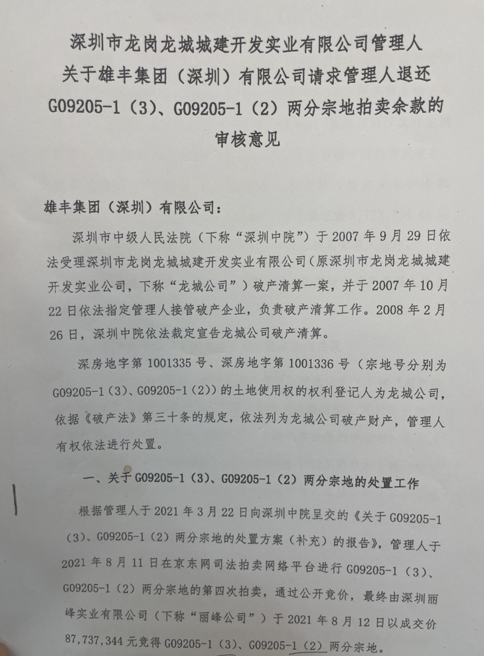 由于法律关系复杂,被推向公开市场的使用权并不被看好,该地块在2021年5月到8月期间,前后经历了3次降价和流拍,最终在第四次拍卖时,被深圳丽峰实业有限公司(下称丽峰)拍下,成交价为8773万元,丽峰也成为这场困局的新入场者。