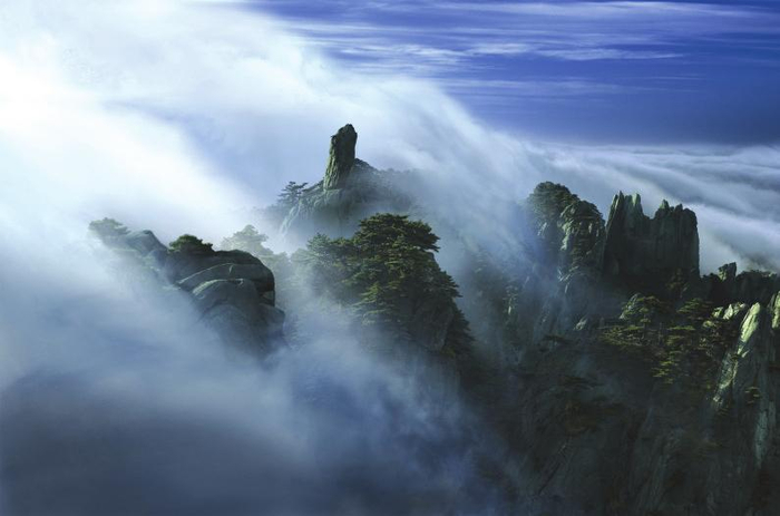 夏季黄山多阵雨,雨后初晴,云雾弥漫,形成云海,在山峦峡谷时隐时现,瞬息万变,气象万千。云以山为体,山以云为衣。飞云铺海时,谷风引动松涛,澎湃之声,不绝于耳。日出或日落时的云海,似涌金流银,令观者惊叹不已。