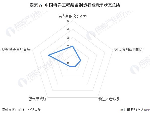 运用波特的“五力”模型,对海洋工程装备制造行业的竞争环境分析中,对各方面的竞争情况进行量化,5代表最大,0代表最小,海洋工程装备制造行业的竞争情况如下图所示:
