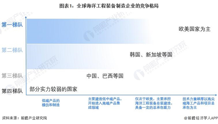 从全球视角看,海洋工程装备建造商可分为四大阵营。处于第一阵营的公司主要在欧美,它们垄断着海洋工程装备开发、设计、工程总包及关键配套设备供货;第二阵营是韩国和新加坡,它们在总装建造领域快速发展,占据领先地位;中国还处于制造中低端产品的第三阵营。