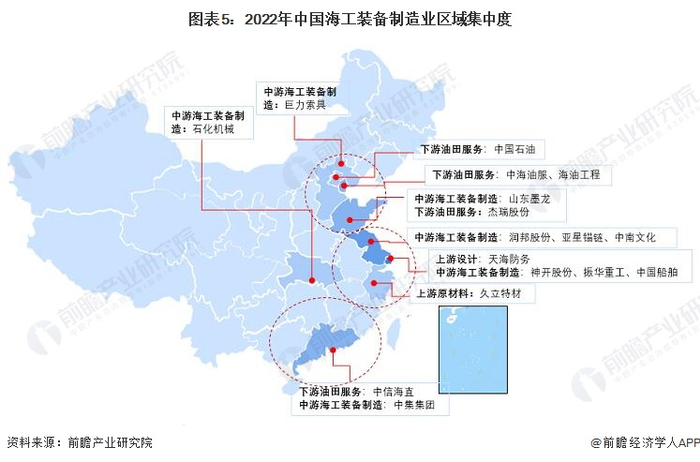 从海洋工程装备制造行业区域集中度看,环渤海、长三角以及珠三角企业集中度较高。环渤海区域代表性企业包括中海油服、海油工程、杰瑞股份等,长三角区域代表性企业主要包括亚星锚链、中国船舶、振华重工等,而珠三角区域代表性企业主要有中信海直、中集集团等。