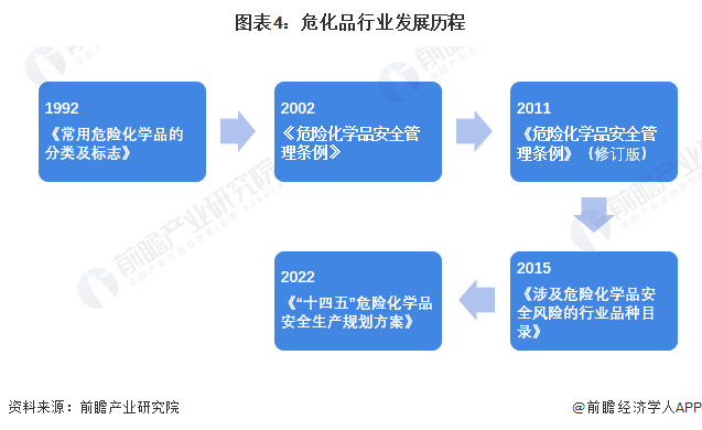 我国危化品发展以安全标准建设为主题。1992年,《常用危险化学品的分类及标志》发布,标志着我国危化品分类的标准建设完成。2002年,国务院发布《危险化学品安全管理条例》,旨在加强危险化学品的安全管理,预防和减少危险化学品事故,保障人民群众生命财产安全。2011年,国务院第144次常务会议对《危险化学品安全管理条例》修订通过,2015年,为深刻吸取天津港“8·12”瑞海公司危险品仓库特别重大火灾爆炸等事故教训,国务院安委会下发了关于印发《涉及危险化学品安全风险的行业品种目录》。2022年,根据“十四五”国家应急体系规划和安全生产规划,应急管理部下发《“十四五”危险化学品安全生产规划方案》,再次对行业安全发展进行规范。