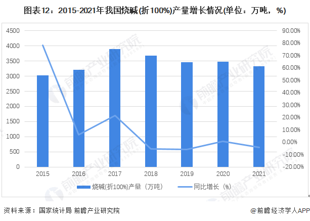 根据国家统计局最新数据,2020年我国烧碱(折100%)产量3475.47万吨,同比增长0.51%;2021年烧碱(折100%)产量2825.7万吨,同比下降4.21%,预计未来产能或将保持稳定。