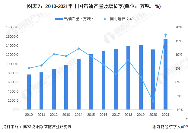 2020年受疫情的冲击,汽油市场需求大幅下滑。2020年全国汽油产量为13179.7万吨,同比下降7.03%。全年来看,中国成品油产量低位出现在第一季度,由于2020年春节假期延长,疫情蔓延令众多炼厂开工负荷迅速下滑,主营单位和山东独立炼厂均在一季度迎来年内低点。2-3月份因疫情全国处在封锁状态,3月份汽油产量最低,后随着复产复工,汽油产量逐渐增加,基本恢复至往年同期水平。2021年全年,汽油产量达15457.3万吨,同比累计增长17.3%。