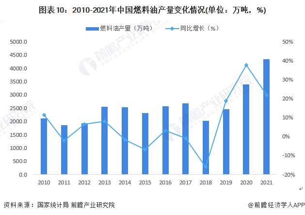 2010-2019年,我国燃料油产量波动范围较大。2019年我国燃料油产量为2469.7万吨,同比增长19%。2020年,燃料油产量为3406.3万吨,同比增长37.9%。2021年,燃料油产量为4350.2万吨,同比累计增长22.1%。