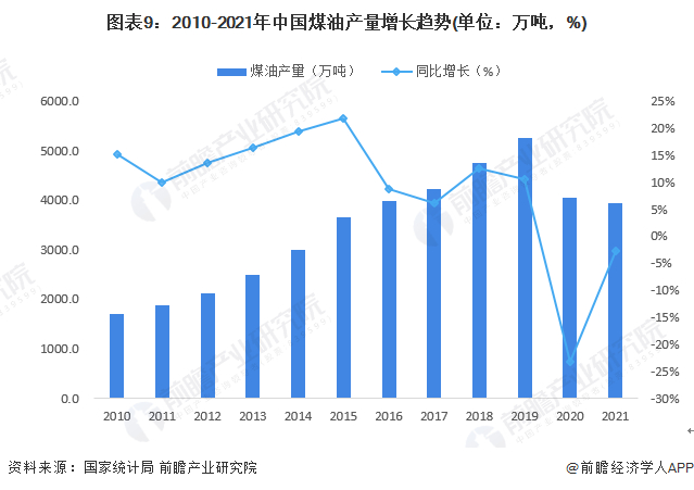 2010-2019年,我国煤油产量逐年增加,到2019年产量达到5272.6万吨,同比增长10.6%;2020年,受国内突发公共卫生事件的影响,春节假期延长,各行业延迟复工,中国煤油产量仅为4049.4万吨,同比下降23.2%; 2021年中国煤油产量3943.9万吨,同比下降2.6%。