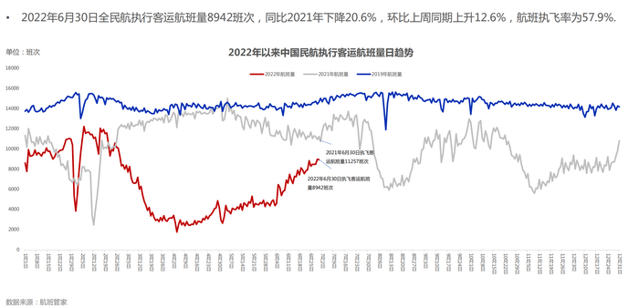 随着6月底高考结束后,旅游行业迎来第一波暑期预订,民航出行量整体呈持续增长态势。据第三方民航数据APP“航班管家”数据显示,6月30日全民航执行客运航班量8942班次,同比2021年下降20.6%,环比上周同期上升12.6%,航班执飞率为57.9%。