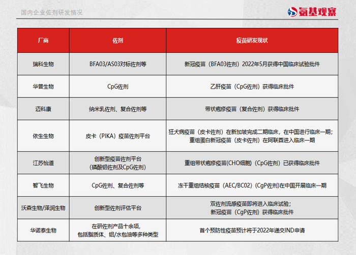 新冠疫情爆发后,国内疫苗供应链被催化强大,佐剂也不再是无名英雄,新型佐剂开发和应用持续加速。国内已有不少玩家开始布局佐剂的研发,试图攻破这一被卡脖子的领域。