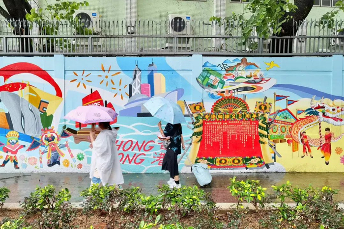 未来五年,中国香港特区政府的施政重点将是发展经济、改善民生,同时确保国家主权、安全和发展利益。图为7月1日下午香港新界市民观看街头的庆祝活动图画墙。《财经》记者 焦建/摄