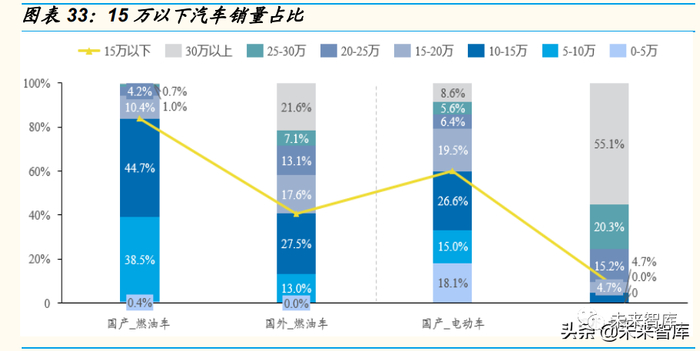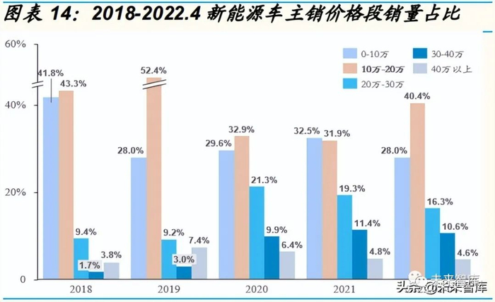 新能源车市场:2021 年 0~5 万销量爆发,达 60.2 万辆,占比 19.94%, 2022 年(1-4 月) 销量达 20.8 万辆,预计全年销量继续提升,但占比降为 15.33%。同时, 10~20 万占比提升明显,从 2021 年的 31.9%提升了 8.5pcts,变为 40.44%。日趋接近成熟燃油车市场近 50%的占比结构。