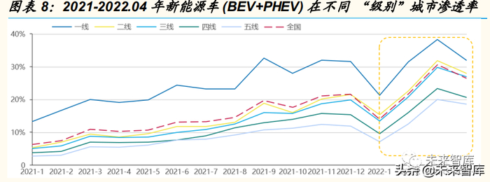 22 年 3 月纯电渗透率 24.8%。22 年 3 月纯电在一二三四五线城市渗透率 分别为 29.72%/25.78%/ 25.16%/ 19.22%/16.34%,同比 21 年 3 月涨幅明 显,均超过 10 个百分点。