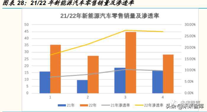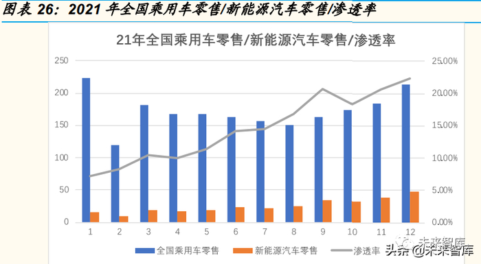 21 年 1-12 月新能源汽车零售销量整体保持增长,其中 2 月销量最低 仅 9.8 万辆,12 月销量达到峰值 47.9 万辆。21 年新能源汽车渗透率 稳步上升,从 1 月份的 7.11%逐月递增,上升至 12 月份的 22.3%。