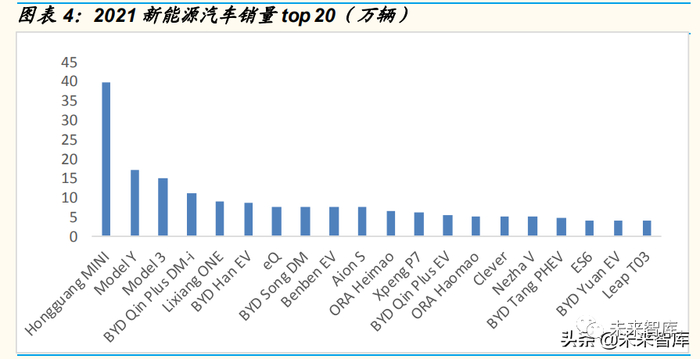 在补贴政策继续延续的背景下,21 年为国内新能源汽车新车型集中上 市放量的一年,下游需求与车型丰富度相互促进、快速增长:1) 下游需求爆发,特斯拉、比亚迪、上通五菱等优质电动车型持续 放量。其中特斯拉 Model Y、比亚迪秦 Plus DM-i、比亚迪秦 Plus EV 以及大众 ID 系列位列新车型累计销量前五位。2) 传统燃油车芯片短缺,销量受阻,多数车企优先保证新能源车芯 片供应,促成新能源汽车销量的提升和渗透率的提高。3) 造成新势力蔚来、理想、小鹏蓄力爬升,随着 8 月芯片短缺、库 存紧张的问题逐步缓解,造车新势力销量稳步增长,市占率基本 保持在 10%以上。4) 国内双碳政策的发布、补贴政策的持续、双积分政策的继续实施, 消费者对新能源汽车的需求快速提升。5) 原材料供给紧缺且价格不断增长,影响整车产能的释放和价格的 攀升,造成终端销量的下降。