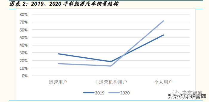 私人购臵比大幅上升,2020 年成“私人消费元年”。2020 年新能源乘用车 实现上险销量首次突破 100 万辆,达 112.58 万辆,同比增长 35.22%,跑 赢整体车市。此外,新能源汽车的私人购臵比重上升,私人消费正在慢慢 打开。2020 年新能源汽车的个人用户比重高达 71.63%,比 2019 年增长 了近 20%,2021 年又提升到 78%,非限购城市私人消费的比例从 40%提 升到 70%,市场化程度逐年提高。