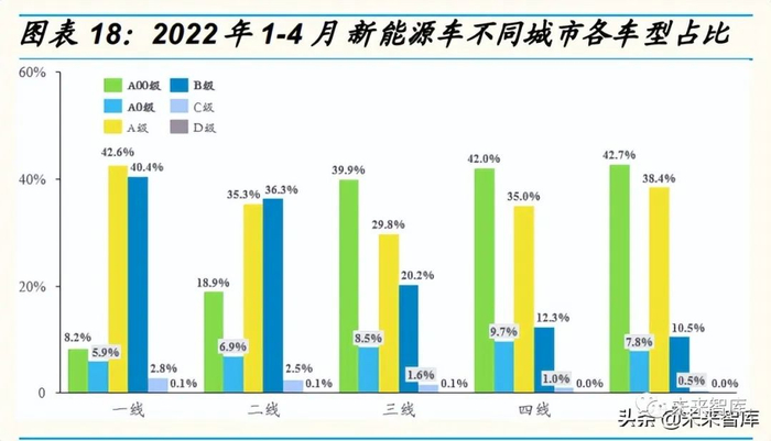 一线城市各车型的占比变化不大,二~五线城市,A、B 级占比提升,A00 级占比日趋下降。三、四、五线城市 A00 占比最高,但呈逐步下滑趋势。2021 年 A00 级车占比分别为 49.6%/53.4%/53.9%,2022 年 1-4 月分别为 39.9%/42.0%/42.7%,二线城市 A00 级车占比也从 23.4%跌至 18.9%。2021 年 A 级车在二三四五线城市占比分别为 32.7%/24.4%/28.5%/31.4%, 2022 年 1-4 月为 35.3%/29.8%/35.0%/38.4%,增速较快,B 级车同样呈 现上升趋势,但增速小于 A 级车。