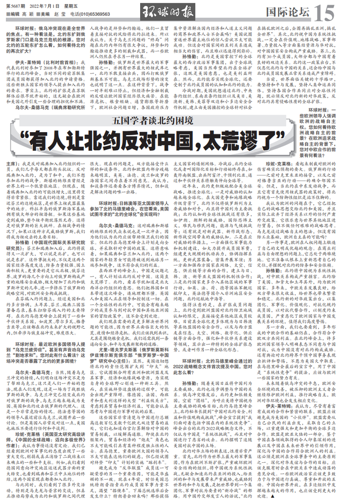 环球时报:俄乌冲突现在是全世界的焦点。有一种看法是,北约东扩到俄罗斯家门口是乌克兰危机的根源。您对北约的五轮东扩怎么看,如何看待北约的再次扩大?