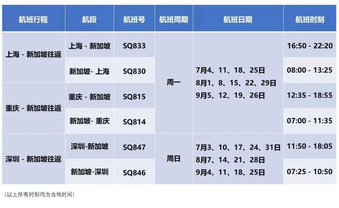 新加坡航空于22年7月1日 – 22年9月30日期间在中国大陆地区将运营以下航线及航班: