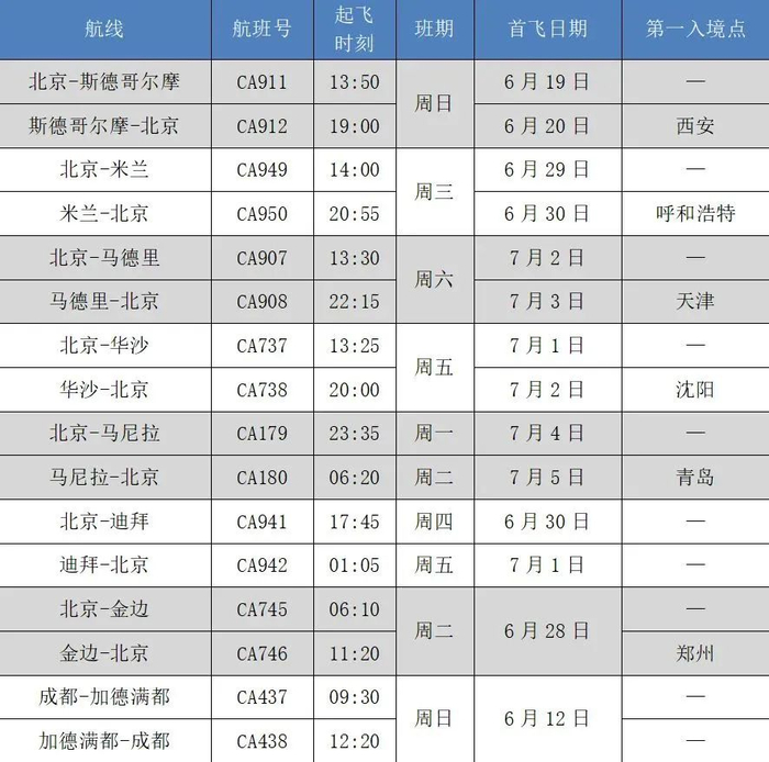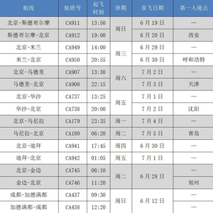 *航班信息展示的班期、起飞时刻均为当地时间,航班计划及第一入境点可能根据政策变化进行调整,请您在出行前关注国航官方渠道查询了解最新航班动态。境外始发航班请优先咨询国航当地营业部。