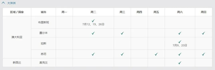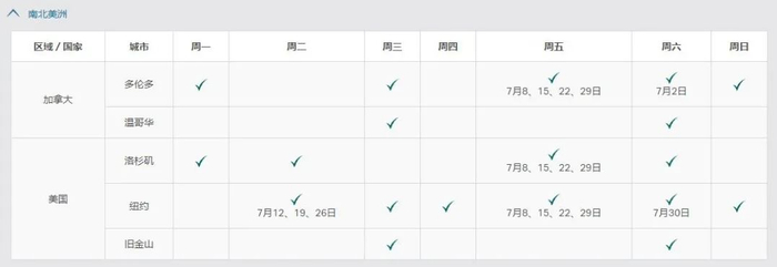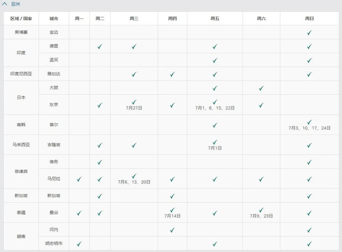 国泰航空公司已更新了2022年7月至9月的航班时间表。请注意,√勾号代表每周有航班在该天营运。如果在表中列出了指定日期,则代表航班只适用於上述日期。