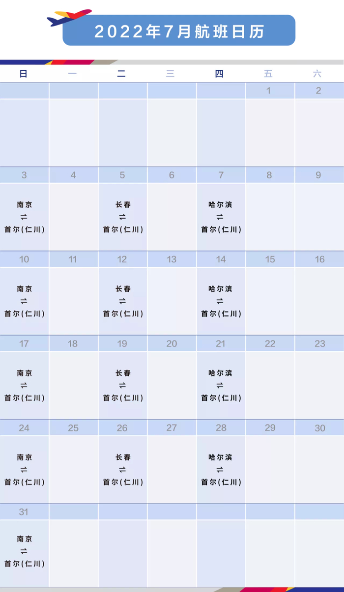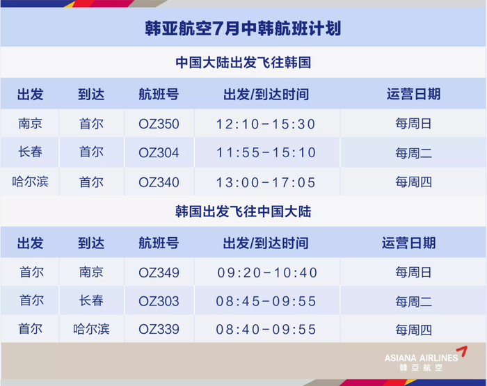 7月起,韩亚航空首尔(仁川)-长春航班恢复运行。旅客可从南京、长春、哈尔滨三座城市乘机往返韩国。7月首尔(仁川)往返中国大陆地区详细航班计划请见下图,请旅客朋友务必仔细对照,以免影响您的行程: