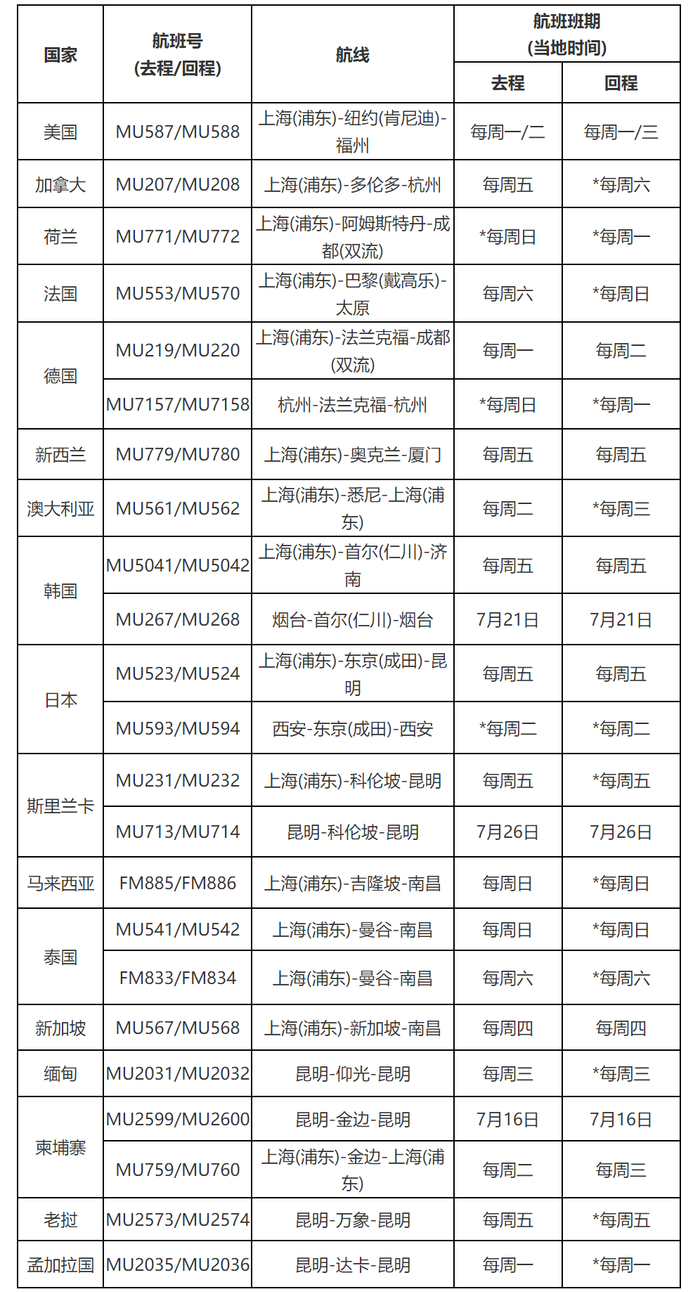 东上航7月国际航班计划