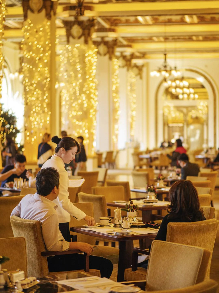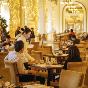 如今半岛酒店的英式下午茶程序已经简化不少,但三层咸甜搭配的茶点则被视为下午茶必不可少的传统,被保留了下来。品尝传统的英式下午茶点时,应遵循先咸后甜、先清爽后厚重的原则,先享用置于底层的咸点,再依次向上层递进。但在半岛酒店的下午茶里,松饼是个例外。松饼只有热吃,才能享用到最佳口感,配淡奶油和特制的草莓酱,独具风味。因而即便它是甜点,也破例摆在了底层盘子里。下午茶的点心会根据季节的更替而变化组合,夏季时有许多与新鲜时令水果相关的点心,冬季时则是诸如栗子、巧克力等有着温暖口感的甜点。