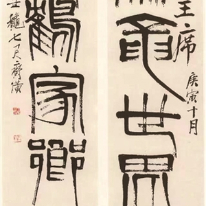 《苍鹰图》是齐白石依据“八大山人”朱耷的晚年佳作《独立睥睨图》创作而成。画面上,一头雄鹰矗立在奇绝孤高的松树上,鹰爪尖利,气宇轩昂,苍劲雄健,顾盼生姿,洋溢着拙厚朴茂的生命气息,堪称齐白石最得意之作。他特意补题了上款“毛泽东主席 庚寅十月 齐璜”,落款“九十翁齐白石画藏”。上款字形稍大,反映出画家对领袖的敬仰与热爱。篆书对联《海为龙世界 云是鹤家乡》,原落款“丁丑秋七尺齐璜”,馈赠时补题了上款“毛泽东主席 庚寅十月”。此联笔墨老辣,纵横恣情,含意深远。