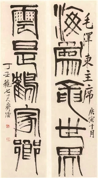 这年10月,为感谢毛泽东的知遇之恩,齐白石从自己历年留存的书画作品中精选出两件,作为礼物赠送给毛泽东:一件是作于1941年的国画《苍鹰图》,一件是书于1937年的篆书对联《海为龙世界 云是鹤家乡》。