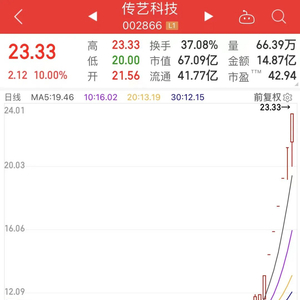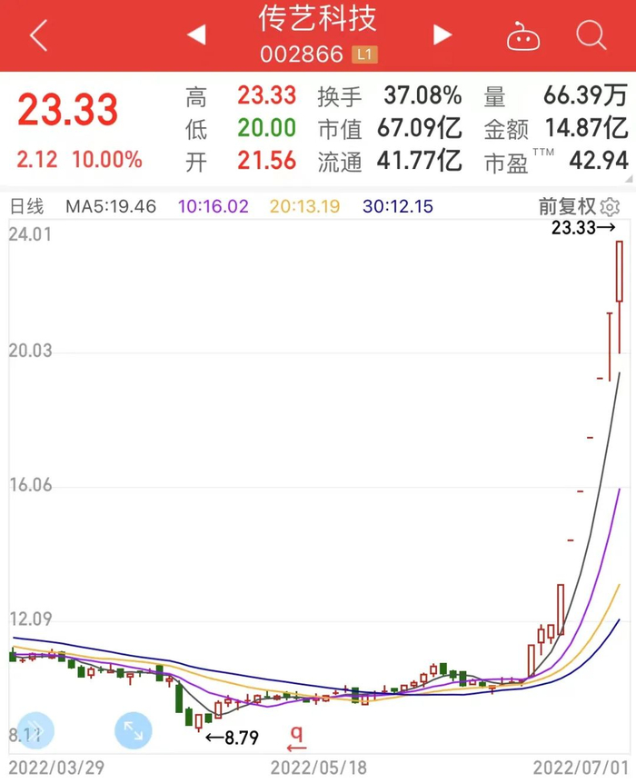 传艺科技昨日涨停,股价10天里收获8个涨停板,7月1日全天成交额14.87亿元,换手率37.08%。