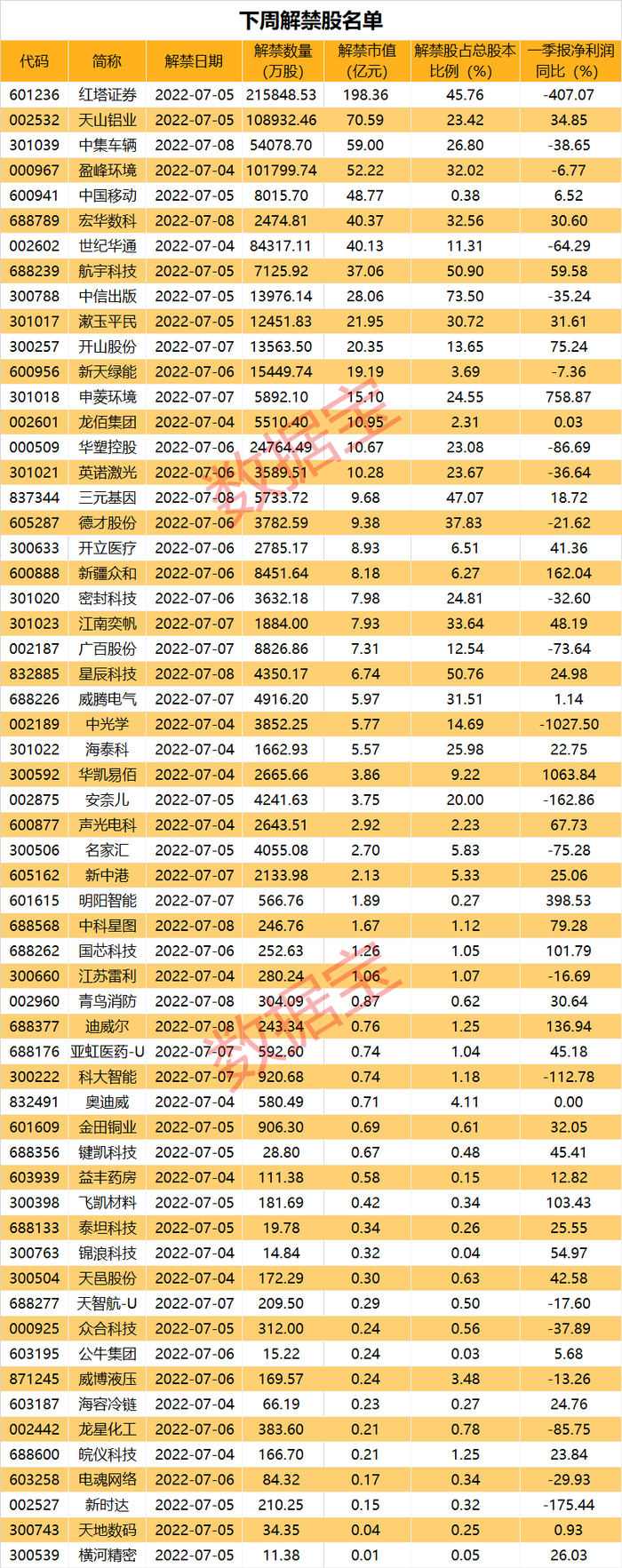 红塔证券的解禁市值最大,下周将有21.58亿股上市流通,主要是首发原股东限售股份,解禁市值达198.36亿元。天山铝业、中集车辆、盈峰环境、中国移动的解禁市值居前。