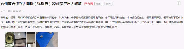 6月4日,有业主在人民网《领导留言板》给台州市市长留言反映,称其所购买的台州黄岩保利大国璟(珑璟府)22号楼的房子自收房以来,房子的装修质量问题层出不穷,出现客厅阳台地砖空鼓、木地板凸起鼓包、餐厅吊顶开裂、餐厅地砖下面有积水、厨具门打开后发霉发臭等质量问题,尤其是每户卫生间漏水严重,楼上卫生间的水会渗透到地板下,进而滴到下一楼层。但多次与保利方面就该问题进行沟通、协商未果,保利方一直推诿、逃避、避重就轻,还想通过简单修补来应付业主。
