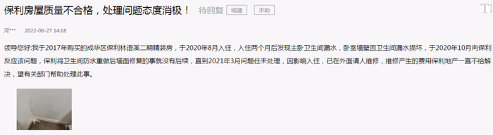 6月27日,还有业主在人民网《领导留言板》给成都市委书记留言反映,称其购买的成华区保利林语溪二期精装房在2020年8月入住两个月后发现主卧卫生间漏水、卧室墙壁因卫生间漏水损坏,但开发商方面仅将卫生间防水重做,墙壁修复的事就不管了。