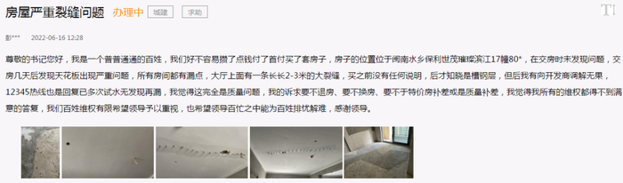 与此同时,6月16日,又有业主在人民网《领导留言板》给漳州市委书记留言反映,称其购买的保利世茂璀璨滨江17幢80*交房几天后发现天花板出现严重问题,所有房间都有漏点,大厅上面有一条长长2-3米的大裂缝,但与开发商调解无果。