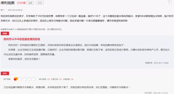 6月4日,还有业主在人民网《领导留言板》给郑州市市长留言反映,称其所购保利珑熙房子的卫生间一直返潮,维修了5个月都没有解决,另外还有9块划痕玻璃也没有更换,每次和开发商交涉,他们口头上承诺的非常好,但实际上根本没有解决问题。经相关部门调查,该业主反映的卫生间返潮问题已维修好,反映的玻璃划痕问题也将进行更换。对此,该业主表示“卫生间返潮问题根本没有解决,玻璃划痕,去年就说给我下单了,到现在都没有给我安装”。