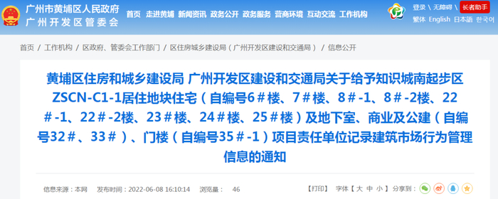 近日,广州黄埔区住房和城乡建设局发布公告,对知识城南起步区ZSCN-C1-1居住地块住宅项目的建设、施工、监理单位进行通报批评。