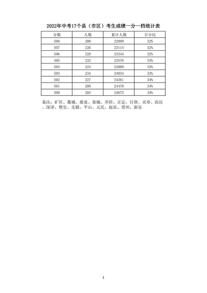 石家庄市中考2022年(含优惠)一分一档统计表(县)