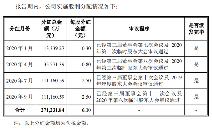 此外,2020年,扬翔股份还进行了四次大额分红,累计逾27亿元,分红总金额占当期净利润的65.07%。