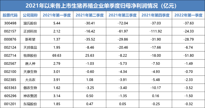 由上图可知,温氏股份、正邦科技、新希望、牧原股份近三个季度全部亏损。