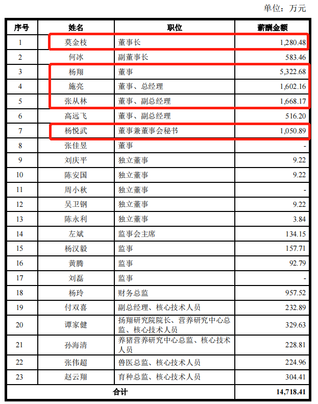 其中,杨翔是扬翔股份创始人、董事;施亮为公司董事、总经理;莫金枝为公司董事长;张从林为公司董事、副总经理;杨悦武为董事、董事会秘书。