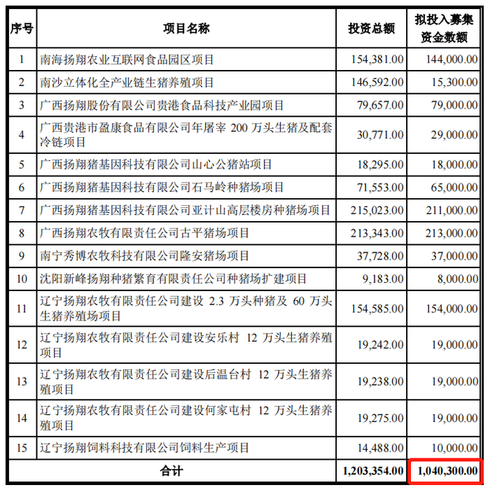 扬翔股份此次IPO计划发行不超过1.48亿股、募资104.03亿元,共计投向15个项目的建设,其中多个项目涉及到生猪养殖产能扩产。