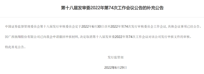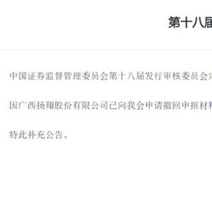 近日,证监会发布公告,因广西扬翔股份有限公司(“扬翔股份”)已申请撤回申报材料,决定取消第十八届发审委2022年第74次工作会议对该公司发行申报文件的审核。