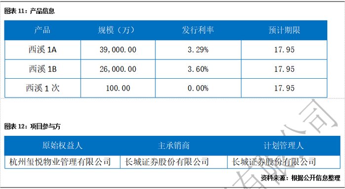 6月14日,杭州西溪投资发展有限公司作为实际融资人的“长城-杭州西溪投资资产支持专项计划”在交易所成功发行。本期产品总规模6.51亿元,其中优先A级3.9亿元,期限18年,AAA评级,发行利率3.29%;优先B级2.6亿元,期限18年,AA+评级,发行利率3.60%;次级档0.01亿元,无评级。本期产品增信机构为杭州商旅和西湖文旅,计划管理人和销售机构为长城证券、监管行和托管行为民生银行,评级机构为上海新世纪,法律顾问为中伦律所,评估机构为国策评估,其他参与机构包括杭州联合银行、浦发银行和杭州银行等