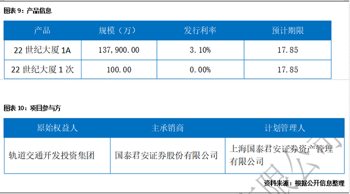 6月23日,上海浦东轨道交通开发投资(集团)有限公司作为原始权益人的“国君-浦开-333世纪大厦资产支持专项计划”在上交所成功发行,项目规模13.80亿元。其中优先级13.79亿元,AAA评级,期限18年(3*6,每3年开放一次),发行利率3.1%;次级0.01亿元,无评级。据悉,本期产品标的资产为333世纪大厦,立信中诚估价20.63亿,差额支付承诺人和流动性支持机构为上海浦东开发(集团)有限公司,计划管理人为国泰君安资管,牵头主承销商国泰君安证券,联席主承销商为申万宏源证券,律师事务所为大成律所。
