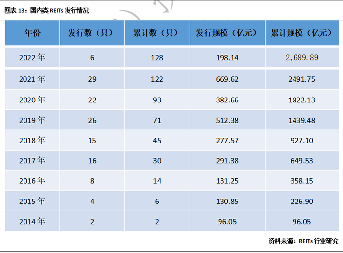 截至2022年6月,国内共发行类REITs产品128只,发行规模总计2,689.89亿元。