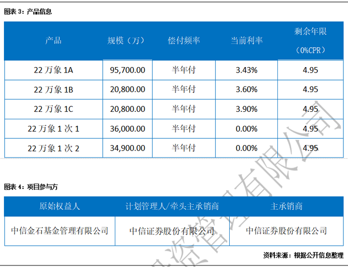 6月10日,华润置地控股有限公司作为流动性支持机构、维好承诺人和优先收购权人的“中信金石-华润置地万象1期资产支持专项计划之计划”在深交所成功发行。资料显示,项目储架规模80亿元,首期规模20.82亿元,标的物业杭州萧山万象汇。其中优先A级9.57亿元,占比45.96%,3+2年,AAA评级,发行利率3.43%;优先B级2.08亿元,占比9.99%,3+2年,AA+评级,发行利率3.60%;优先C级2.08亿元,占比9.99%,3+2,AA评级,发行利率3.90%。权益A级和权益B级规模分别为3.6亿元和3.49亿元,无评级。本期产品原始权益人中信金石,计划管理人中信证券,托管银行为招行银行深圳分行