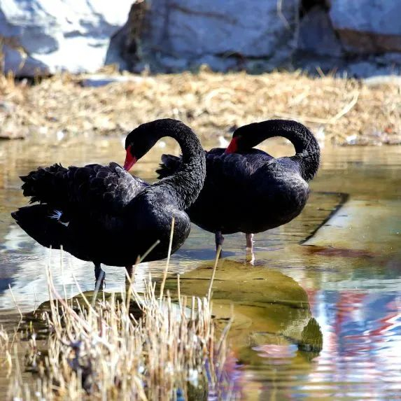 鸟儿们在水中嬉戏、觅食,悠闲地游着,在舒适的“家中”尽情享受生活。偶尔踩着水扑棱几下翅膀。岸边树木枝叶飘摇,就像是一扇幕布,黑天鹅从绿丛中缓缓“亮相”,姿态甚是优雅。